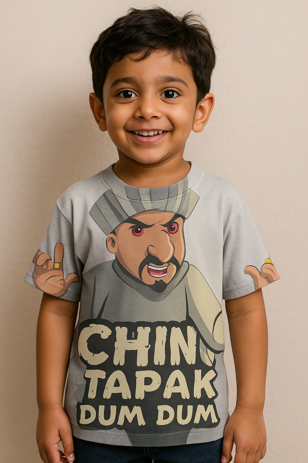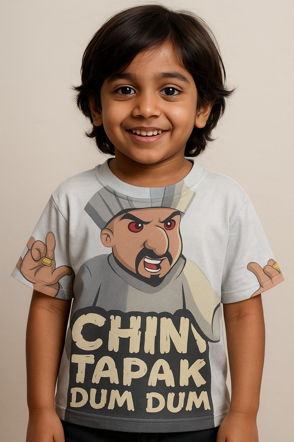 Let your kids and teens stand out in style with the "Chin Tapak Dum Dum" Graphic T-Shirt! Inspired by a viral desi cartoon character, this bold and playful tee adds the perfect punch of humor and attitude to any wardrobe. Crafted from premium, breathable fabric, it’s ideal for daily wear, school, or fun outings.